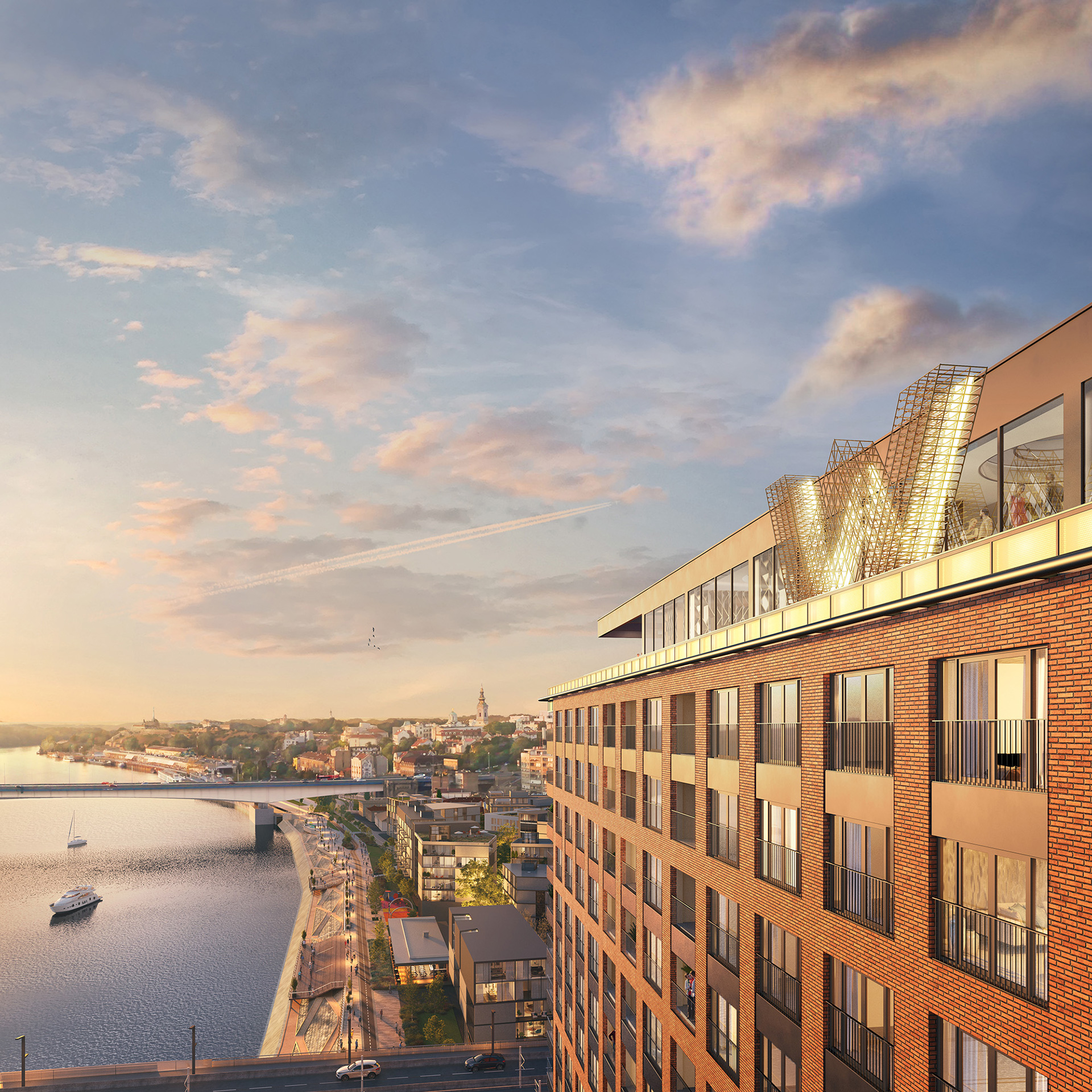 Your apartment is part of a special building, the longer side of which follows the course of the river. From the west, you will be enchanted by the views that stretch across the Sava to Novi Beograd, and from the north to the Sava Bridge, the Belgrade Fortress with Kalemegdan Park, and the confluence of two rivers. The eastern orientation offers beautiful panoramas of the historic center of Belgrade, while the Belgrade Tower and the Bridge on Ada seem to be within easy reach from the south.