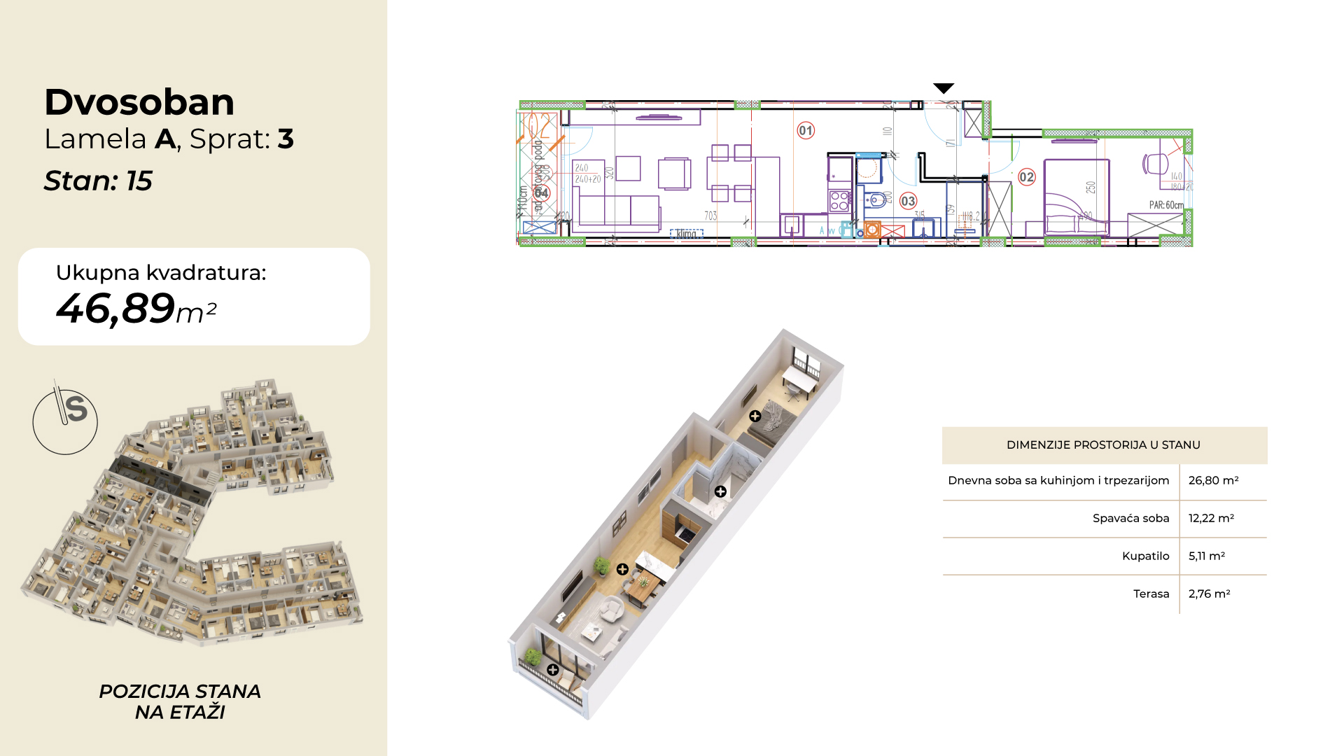 | Lamela A - Stan 15 | 3 | 47 m² | 1 | Dostupan | Plan stana | |