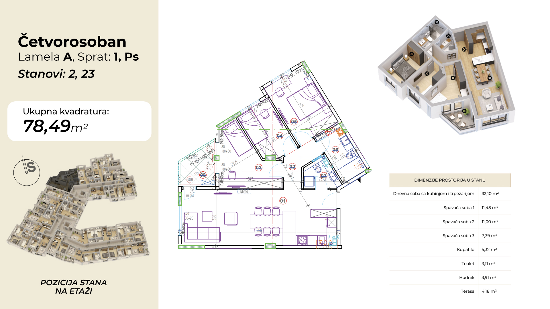 | Lamela A - Stan 23 | 4 | 78 m² | 3 | Dostupan | Plan stana | |