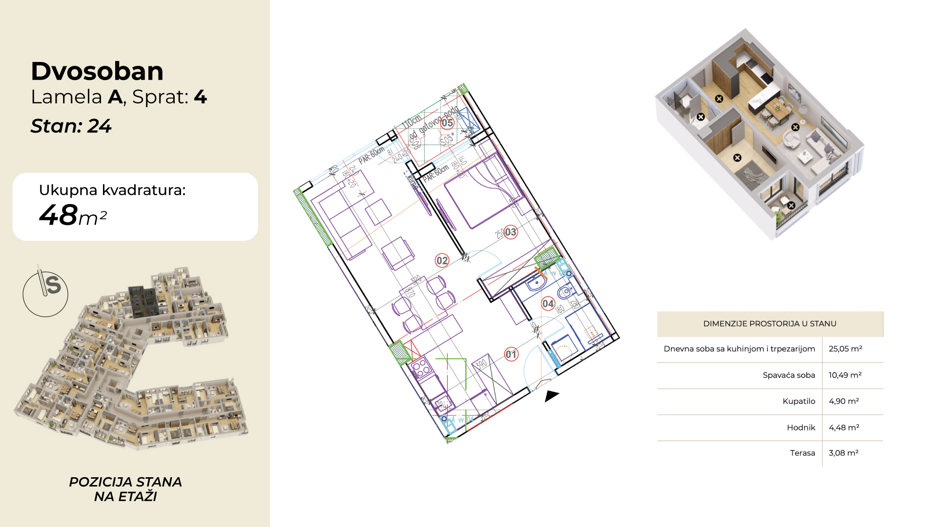 | Lamela A - Stan 24 | 4 | 48 m² | 1 | Dostupan | Plan stana | |