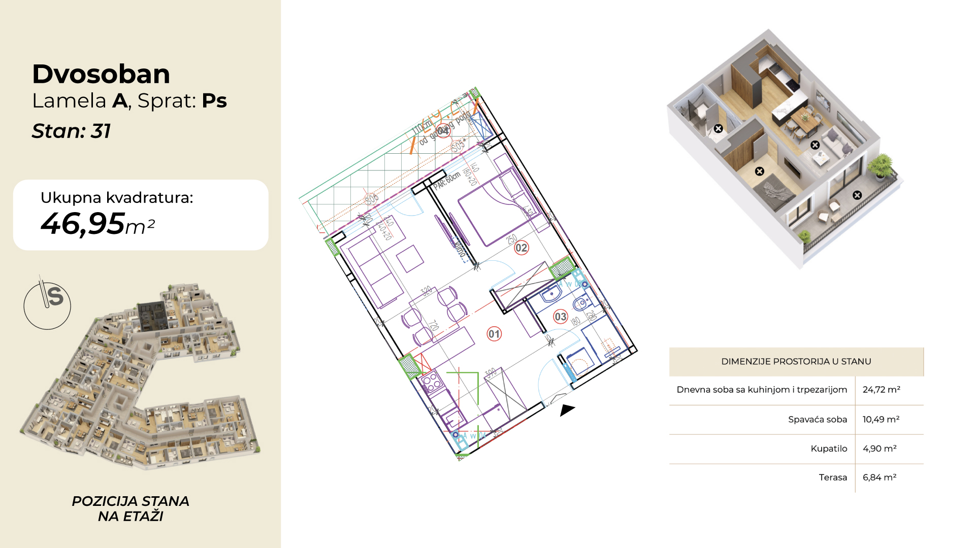 | Lamela A - Stan 31 | Povučeni sprat | 47 m² | 1 | Dostupan | Plan stana | |