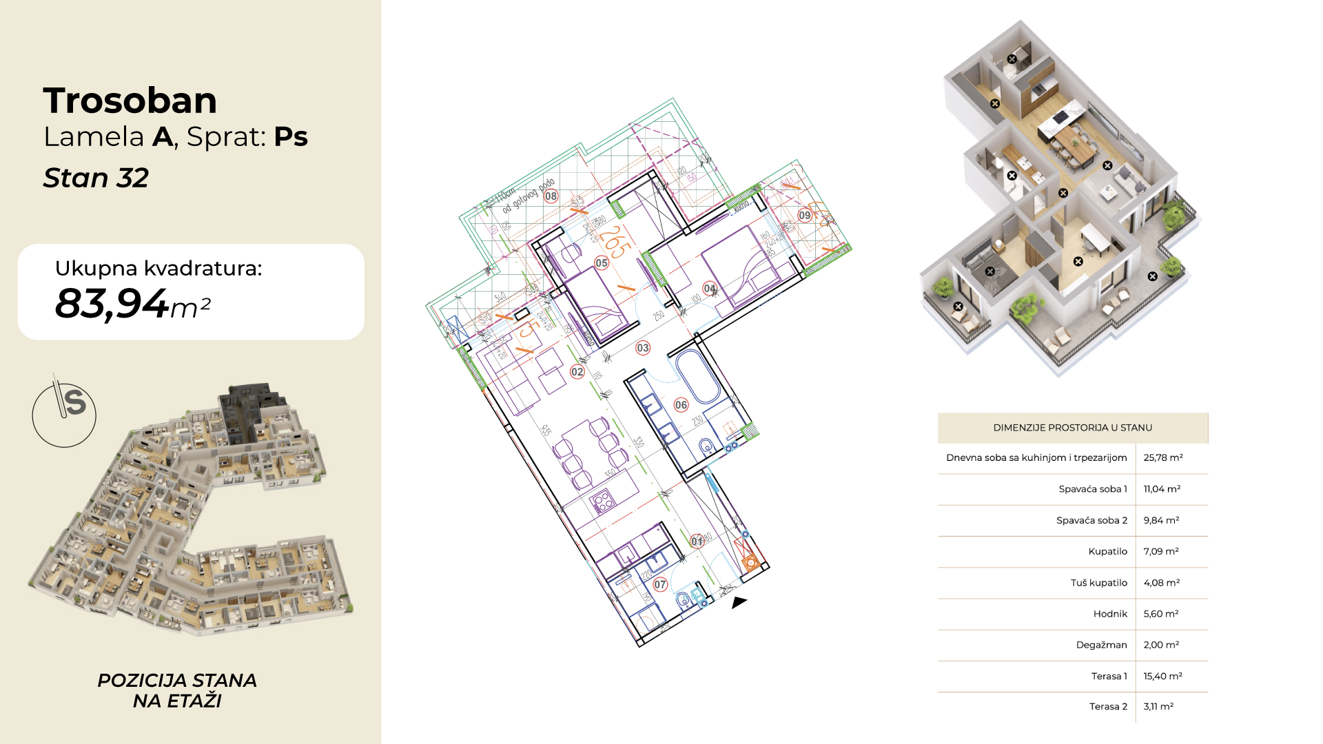 | Lamela A - Stan 32 | Povučeni sprat | 84 m² | 2 | Dostupan | Plan stana | |