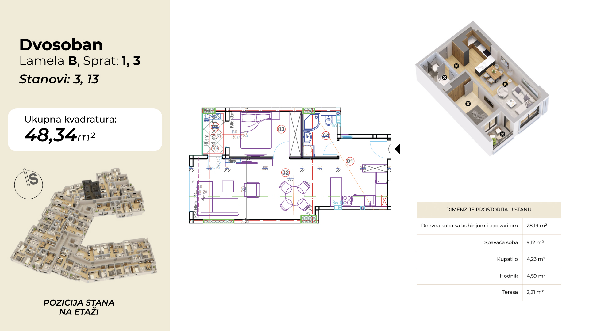 | Lamela B - Stan 13 | 3 | 48 m² | 1 | Dostupan | Plan stana | |