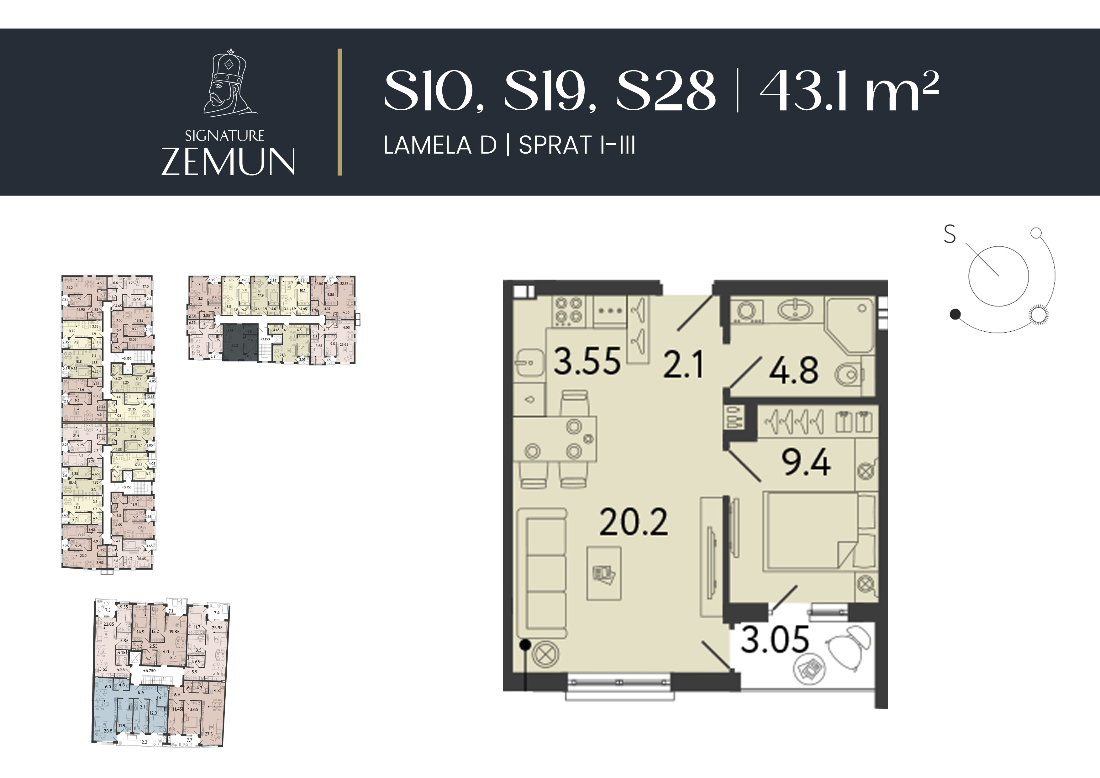 Stambeni kompleks čine četiri lamele, skladno uklopljene u arhitekturu starog Zemuna, sa ukupno 122 stana različitih struktura — od 26 do 100 m². Ponuda obuhvata manje jedinice za kupce koji započinju samostalan život, ali i prostrane porodične domove sa dve i tri spavaće sobe, kao i posebne stanove sa privatnim baštama ili velikim terasama.
