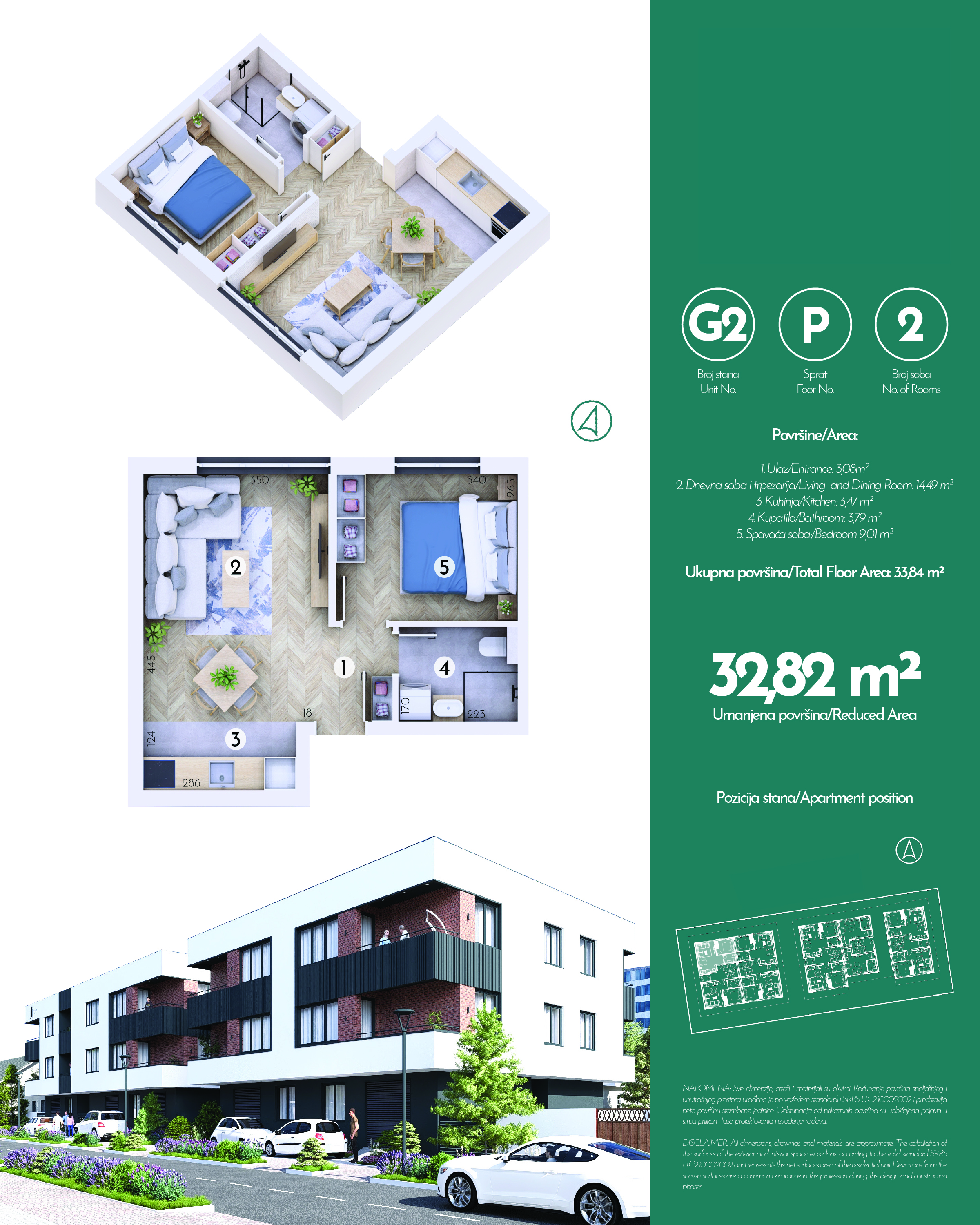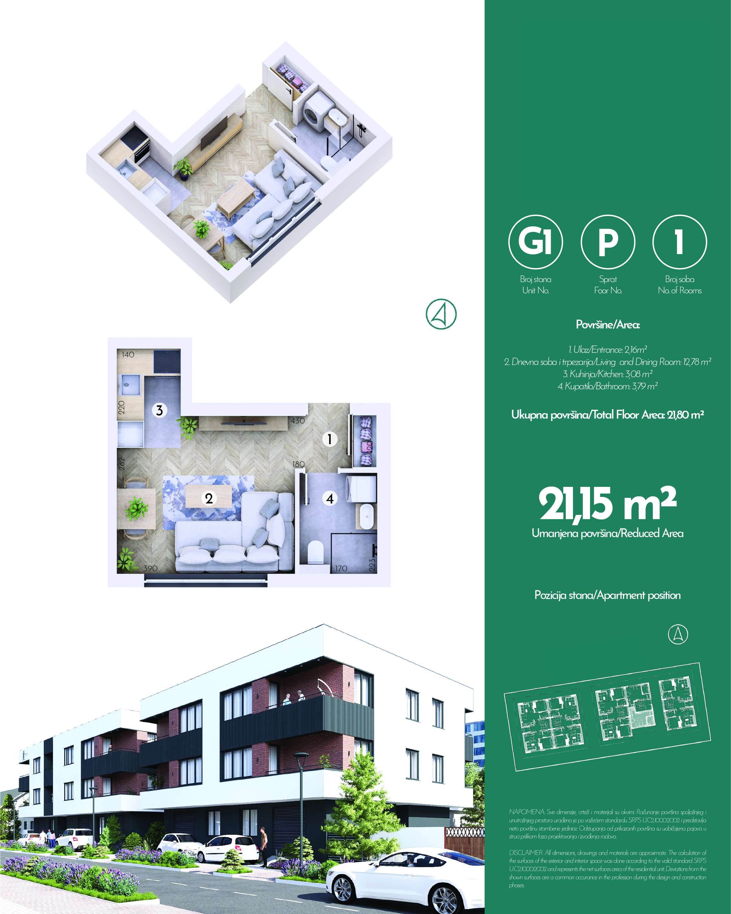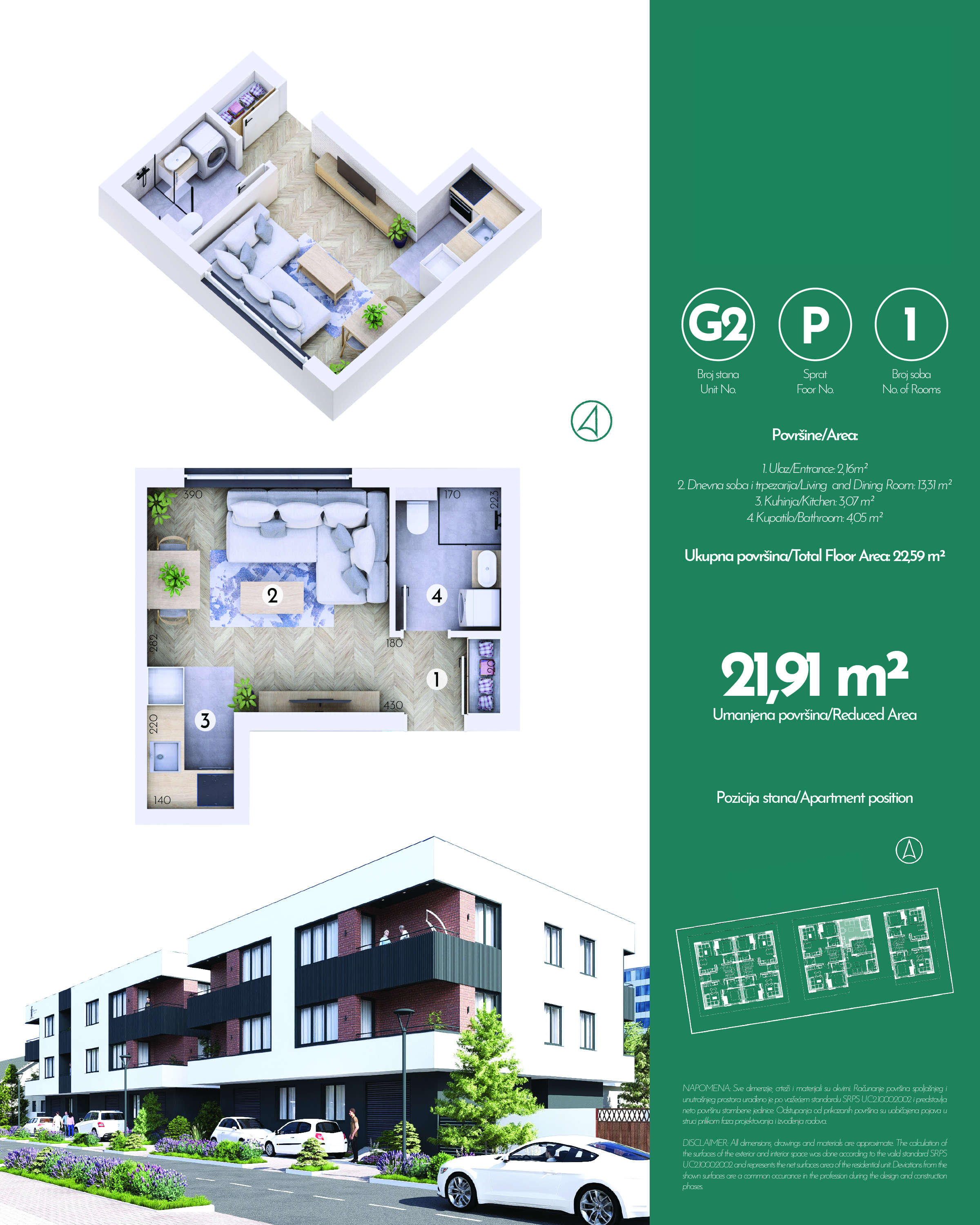 Ukupno 20 stambenih jedinica je projektovano tako da zadovolje potrebe porodica koje traže funkcionalnost, privatnost i udobnost. Dvosobne jedinice od oko 42 m² imaju odvojenu spavaću sobu, dok trosobne jedinice od oko 50–53 m² nude dve komforne spavaće sobe. Svaki stan odlikuje odlična organizacija prostora, prirodna svetlost i praktična raspodela prostorija. Parking mesta su spoljašnja, numerisana i dostupna uz doplatu.