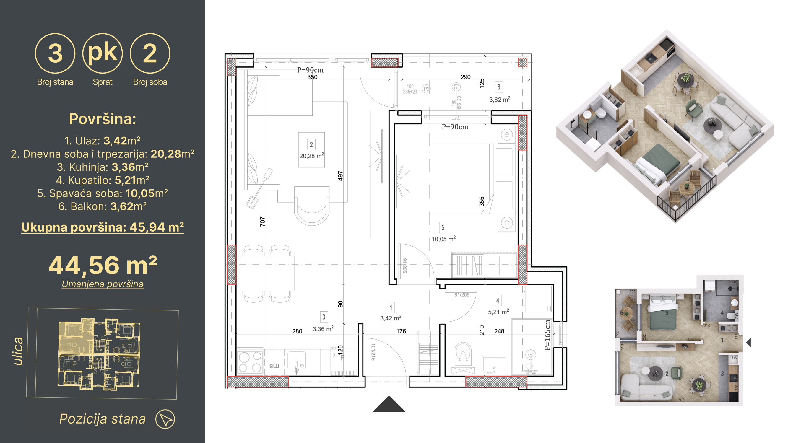Projekat se sastoji od dvojnog stambenog objekta koji obuhvata prizemlje, sprat i potkrovlje sa ukupno osam stanova. Svi stanovi imaju identičnu strukturu i kvadraturu od 44,56 m², što predstavlja trenutno najtraženiji format na tržištu – idealan za kupce prve nekretnine, porodice ili potencijal za izdavanje. Dostupni su fleksibilni načini plaćanja i mogućnost stambenog kredita.