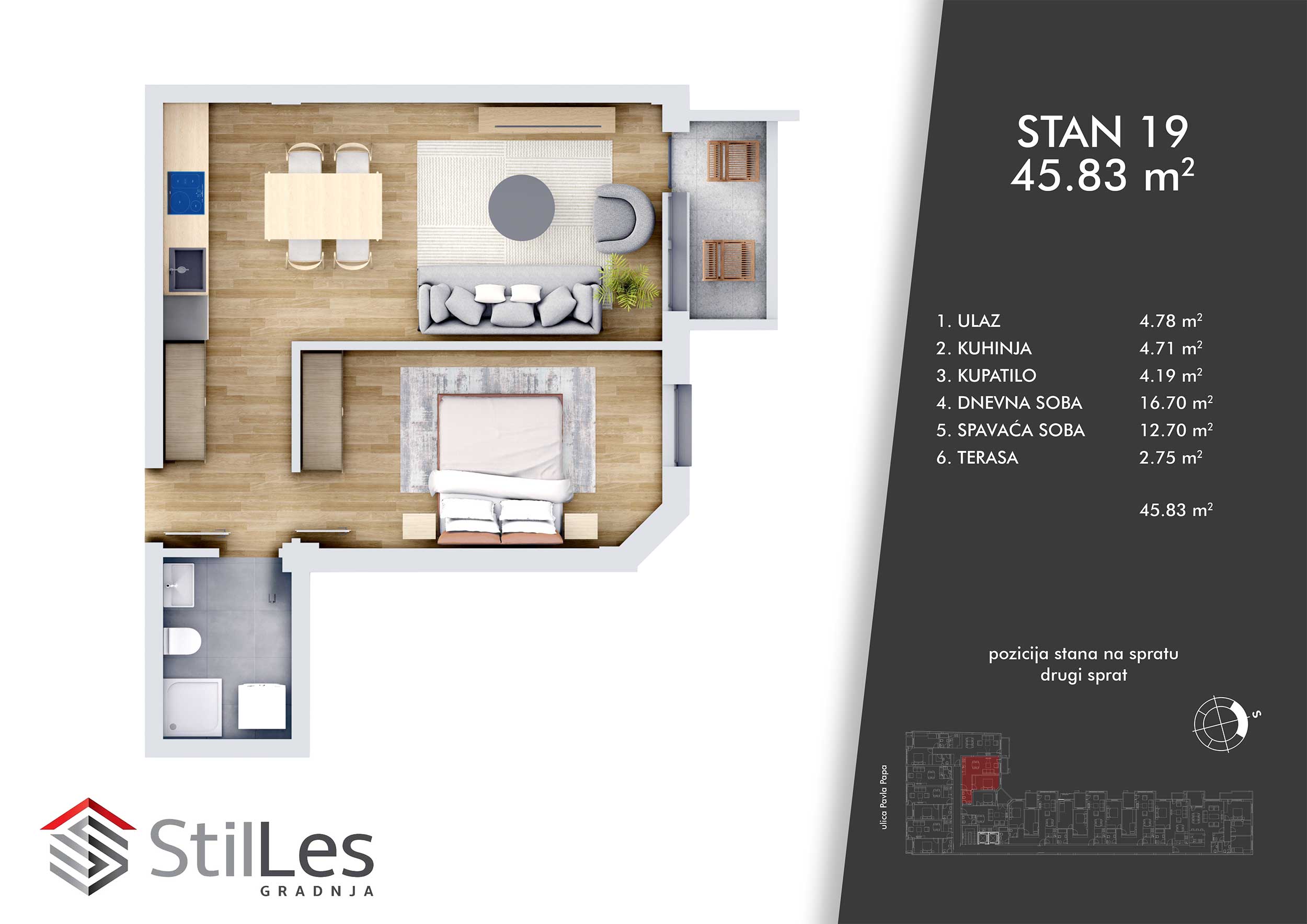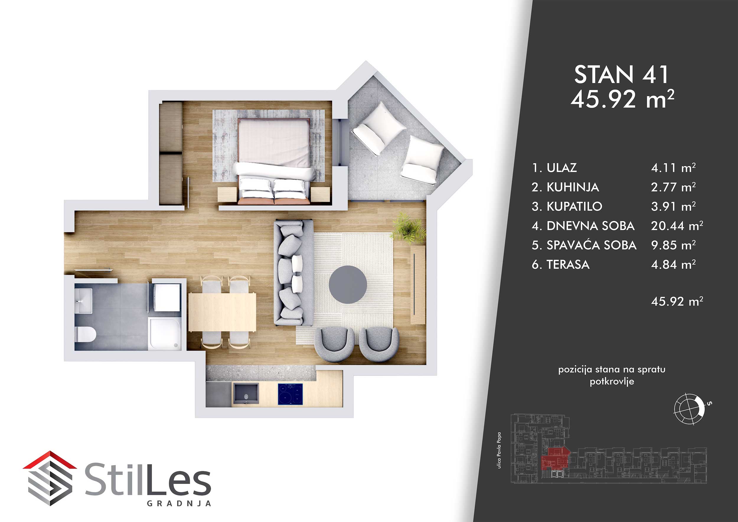 | STAN 41 | Potkrovlje | 46 m² | 1 | Dostupan | Plan stana | |