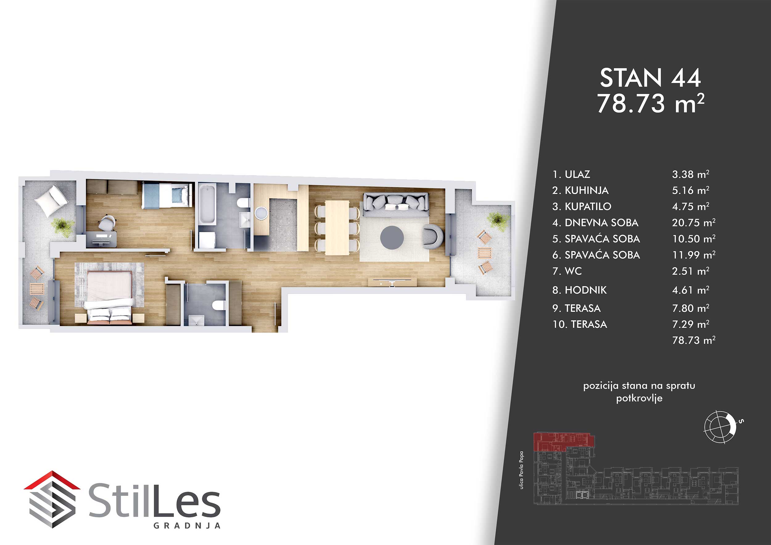 | STAN 44 | Potkrovlje | 79 m² | 2 | Dostupan | Plan stana | |