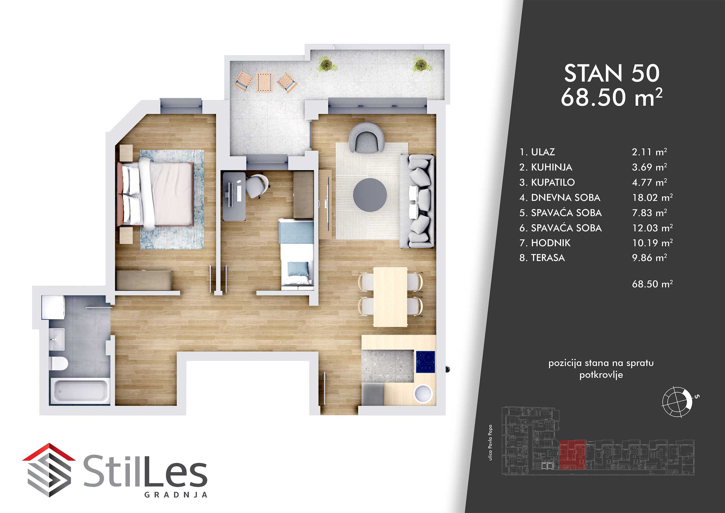 | STAN 50 | Potkrovlje | 73 m² | 2 | Dostupan | Plan stana | |