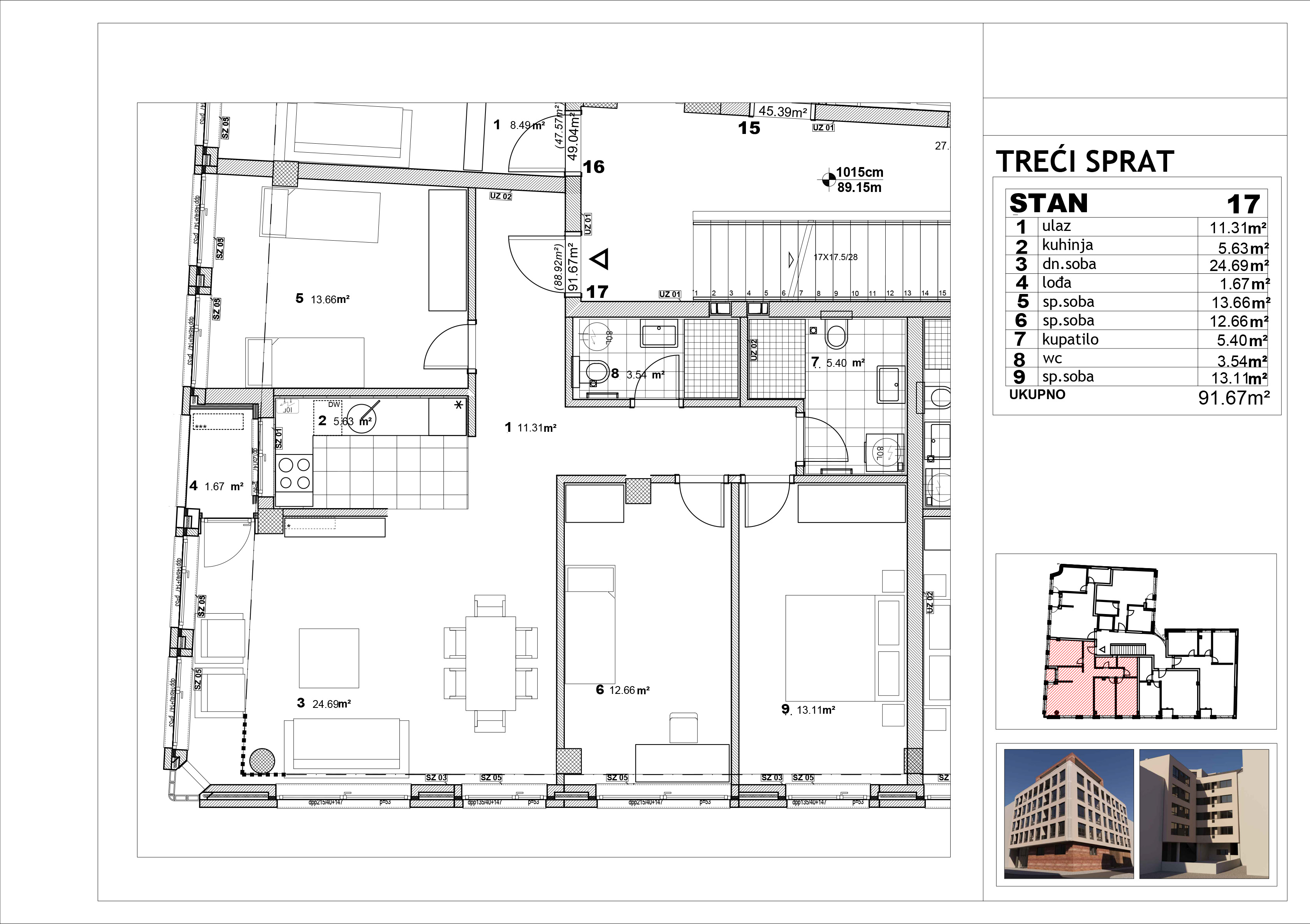 | Stan 17 | 3 | 91 m² | 3 | Prodat | Plan stana | |