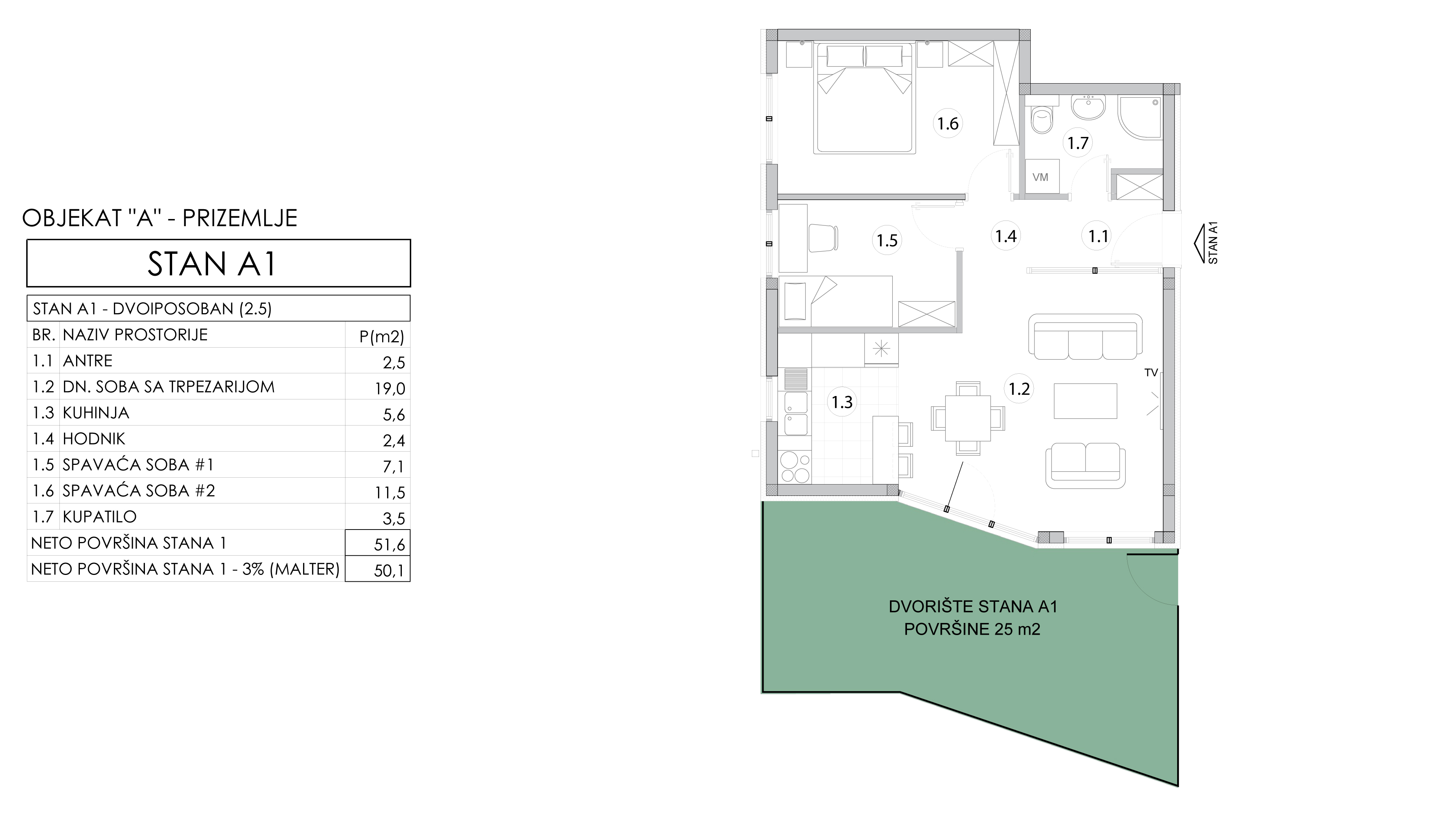 | Objekat A - Stan 1 | Prizemlje | 50 m² | 2 | Dostupan | Plan stana | |