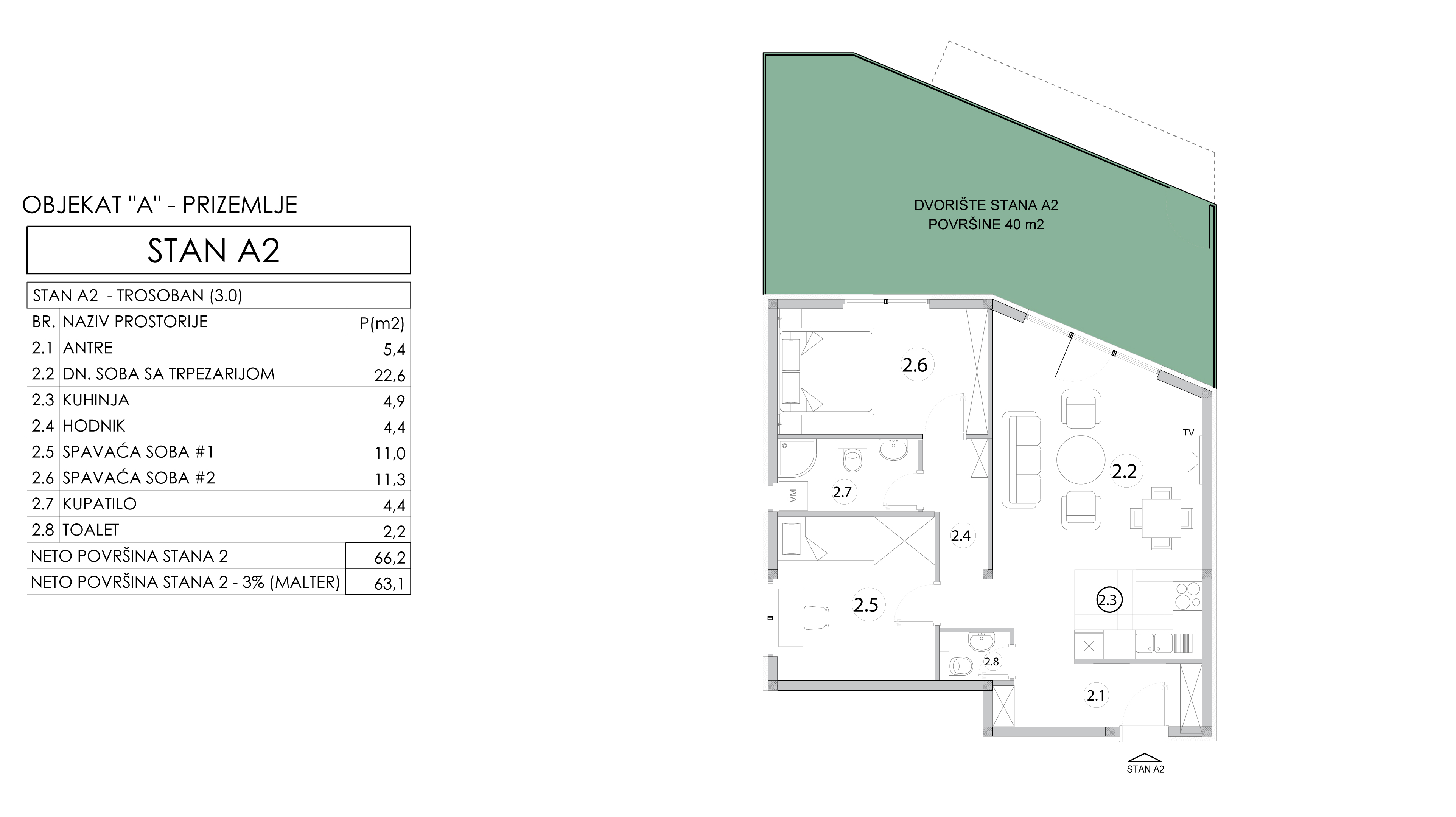 | Objekat A - Stan 2 | Prizemlje | 63 m² | 2 | Dostupan | Plan stana | |