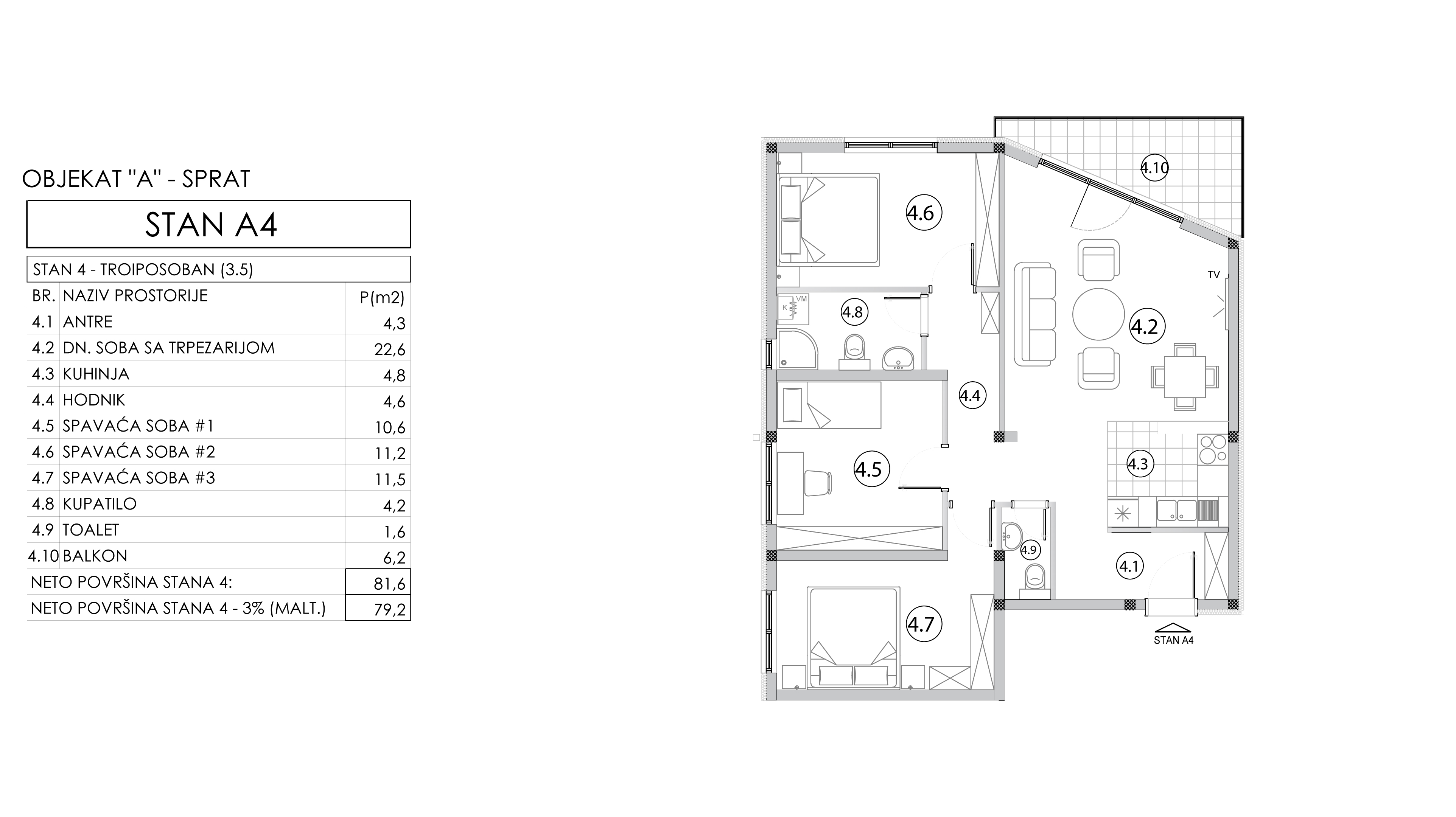 | Objekat A - Stan 4 | 1 | 80 m² | 3 | Dostupan | Plan stana | |