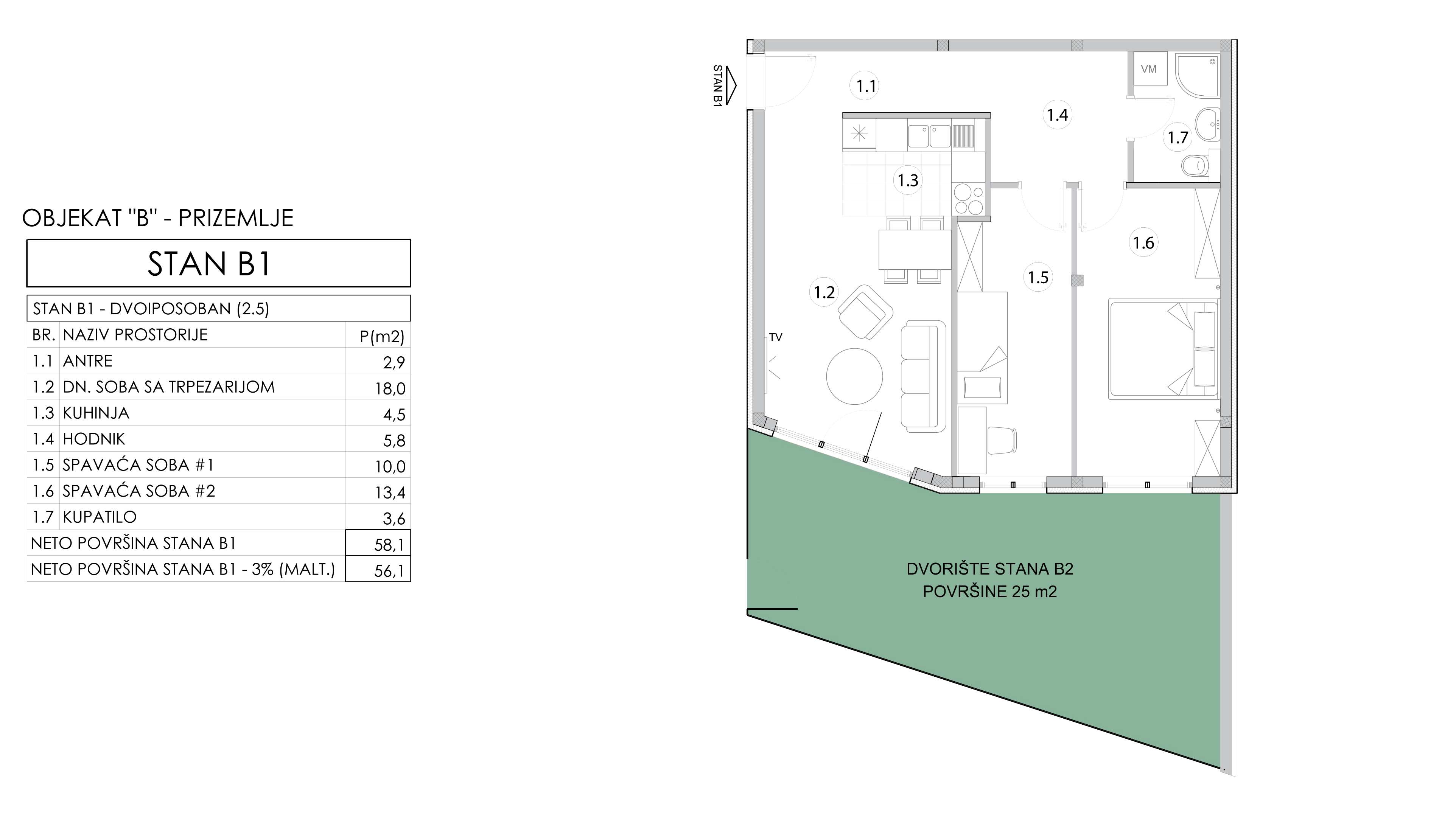 | Objekat B - Stan 1 | Prizemlje | 56 m² | 2 | Dostupan | Plan stana | |