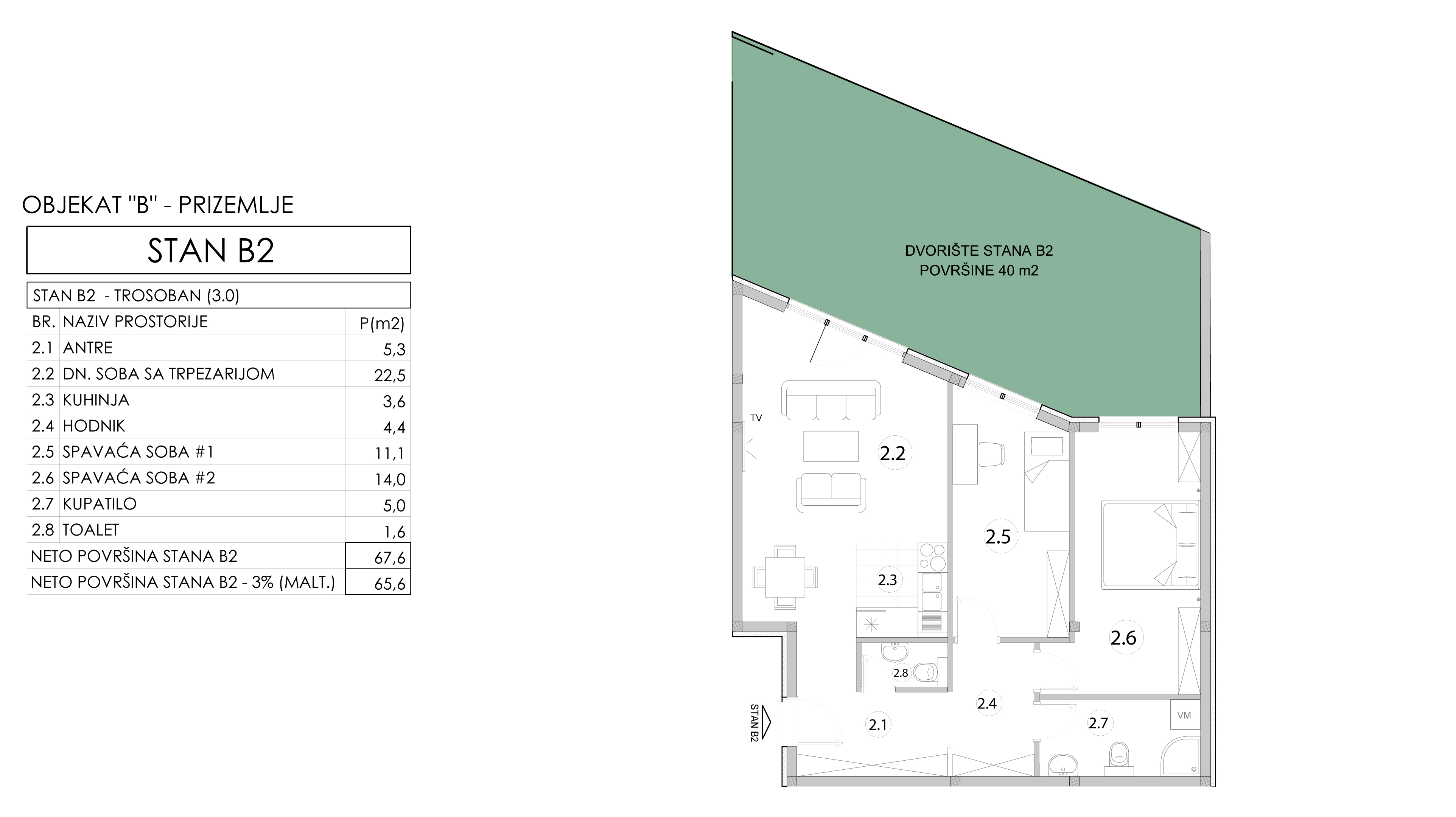 | Objekat B - Stan 2 | Prizemlje | 65 m² | 2 | Dostupan | Plan stana | |
