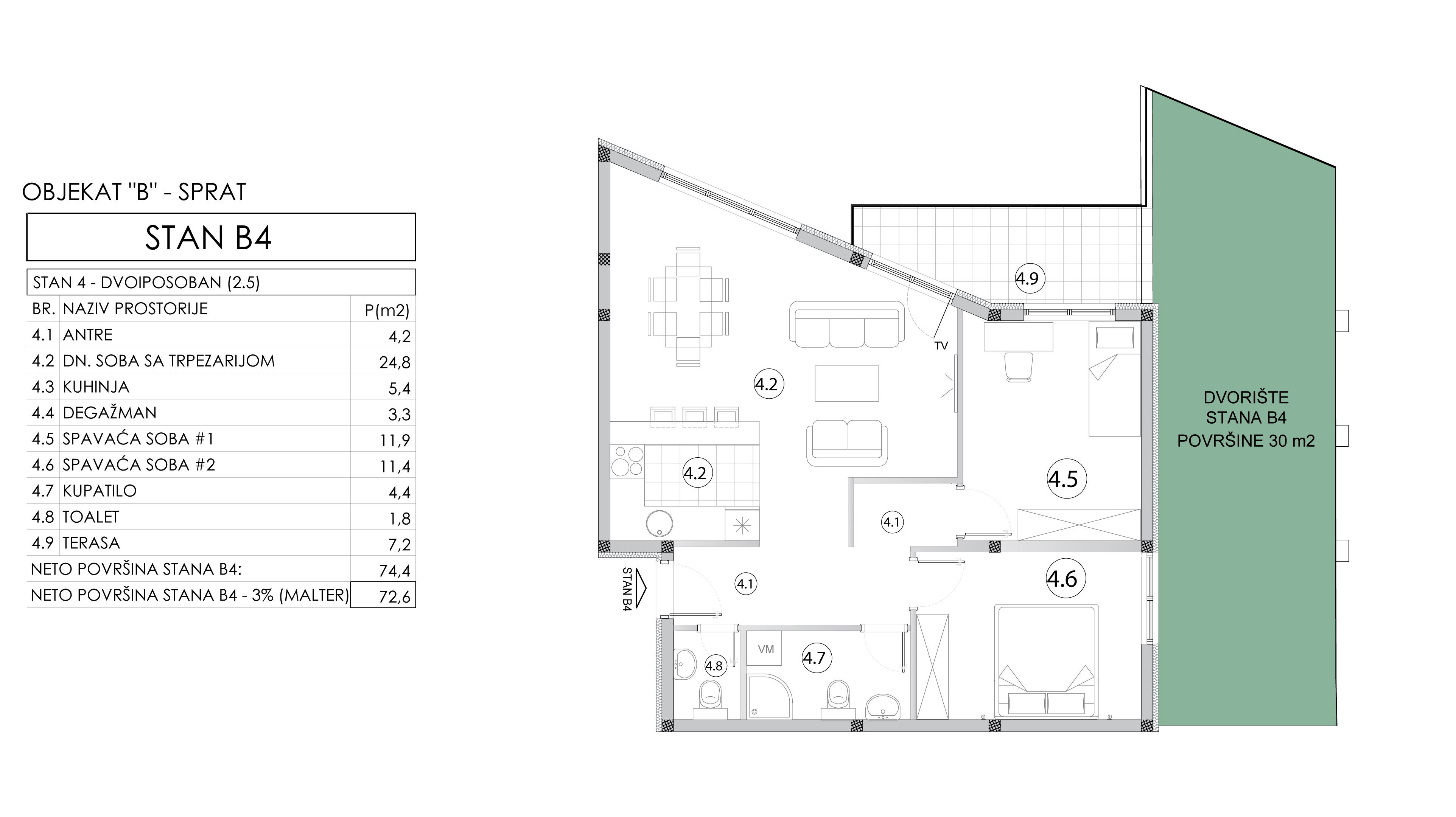 | Objekat B - Stan 4 | 1 | 73 m² | 2 | Dostupan | Plan stana |