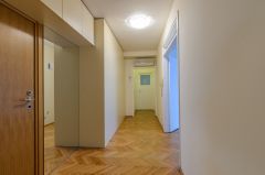 Stan se nalazi na veoma atraktivnoj lokaciji, trostarno je orjentisan. U starom je vlasništvu 1/1 , odnosno nije iz otkupa. Prvi vlasnik. Zgrada je zidana za visoke funkcionere 70-ih godina. Useljena je 1972. godine. Obložena je bračkim mermerom tako da ima odličnu toplotnu i zvučnu izolaciju. Poseduje dva sanitarna čvora, dve terase, dva francuska balkona, u sobama je hrastov parket. Kupatilo ima prirodnu ventilaciju. Na raspolaganju je i podrumska prostorija. U blizini se nalazi šetalište, ambulanta, pijaca, park, Dunav, vrtić, škola, fakulteti, a opet je na neki način izmeštena od gradske vreve sa pogledom na Tvrđavu i zelenilo. Stan ima centralno grejanje video interfon, sigurnosna neprobojna vrata na ulazu u zgradu i stan, lift i video nadzor sa 5 kamera. Dva stana su na spratu i ima samo pet ovakvih stanova. Stan je pogodan za obavljanje poslovne delatnosti kao i za osobe sa invaliditetom, jer nema stepenika odn. barijera. U cenu je uračunata garaža od 14m2, komplet nova i renovirana kuhinja, novi ugradni plakari u predsoblju i jednoj sobi, kao i podrumska prostorija.
